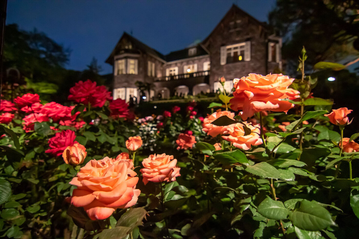 ジョサイア・コンドルという有名建築士が設計した、左右対称の幾何学模様のフランス整形式庭園。洋風の庭園には100種、199株のバラが植えられています。洋館と相まってまるで絵画のような景観で、海外の貴族になった気分で高貴な薔薇を楽しめます。