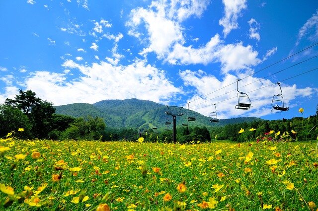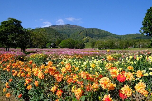 約 50 品種 100 万本の花数と品種を誇る黒姫高原。育苗されたコスモスが一本一本、手で植えられました。黒姫山の麓から眺めるコスモスは圧巻で、海抜 900m の高冷地はコスモスに適した気温から開花期間も長く楽しめます。コスモスの迷路があったり、シーズン最終日にはコスモスを摘み取れたりと、眺める以外の楽しみもありますよ。また、リフトに乗ってコスモスの上を空中散歩ができる変わった鑑賞方法もあります。他にも、犬をリードにつないで散歩ができ、リフトも同乗可能です。2006 年に森林セラピー園として認定されました。信濃町 IC より車で 6 分のアクセスで、見学自由です。