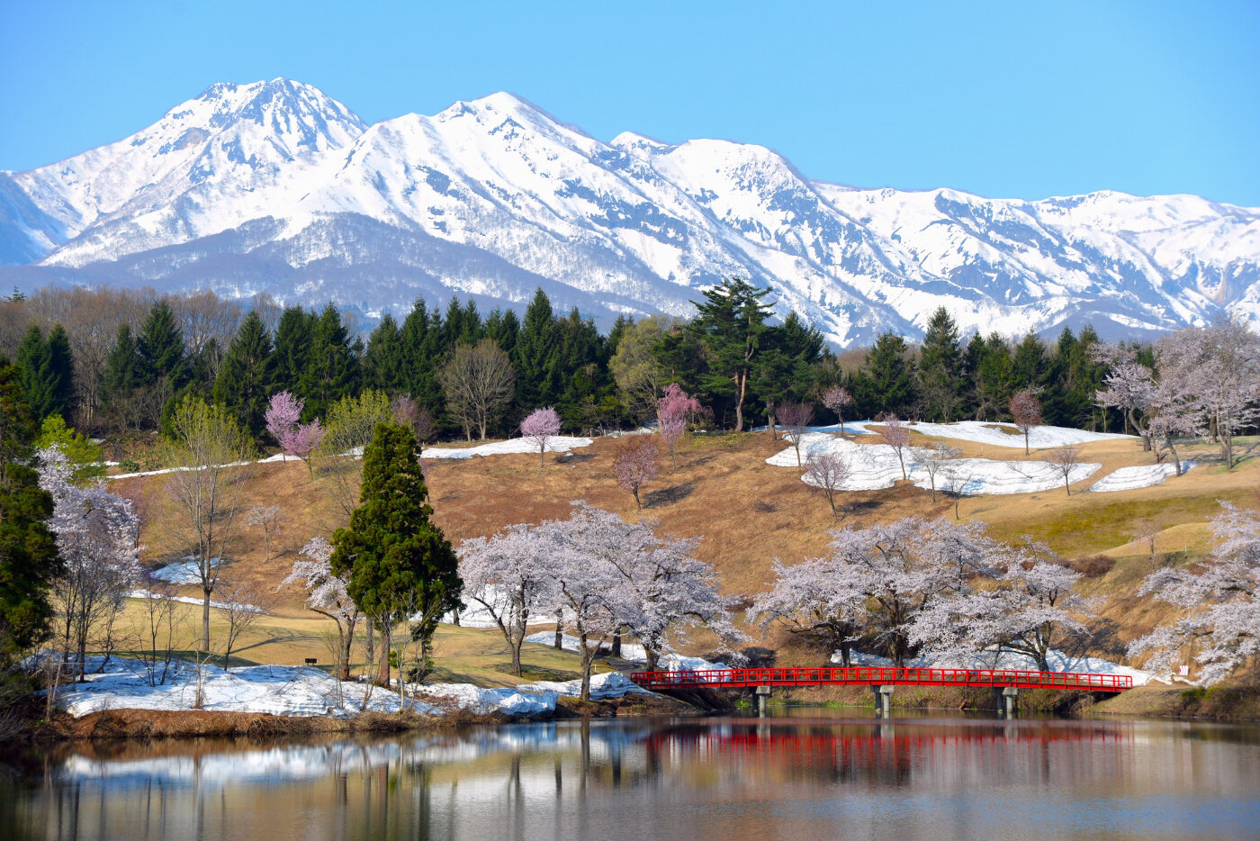 松ヶ峯周辺に約1,500本の桜が植えられていて、新潟景勝百選に選ばれた場所。松ヶ峰池に映る桜と背景の残雪を被った妙高山とのコラボが美しい。