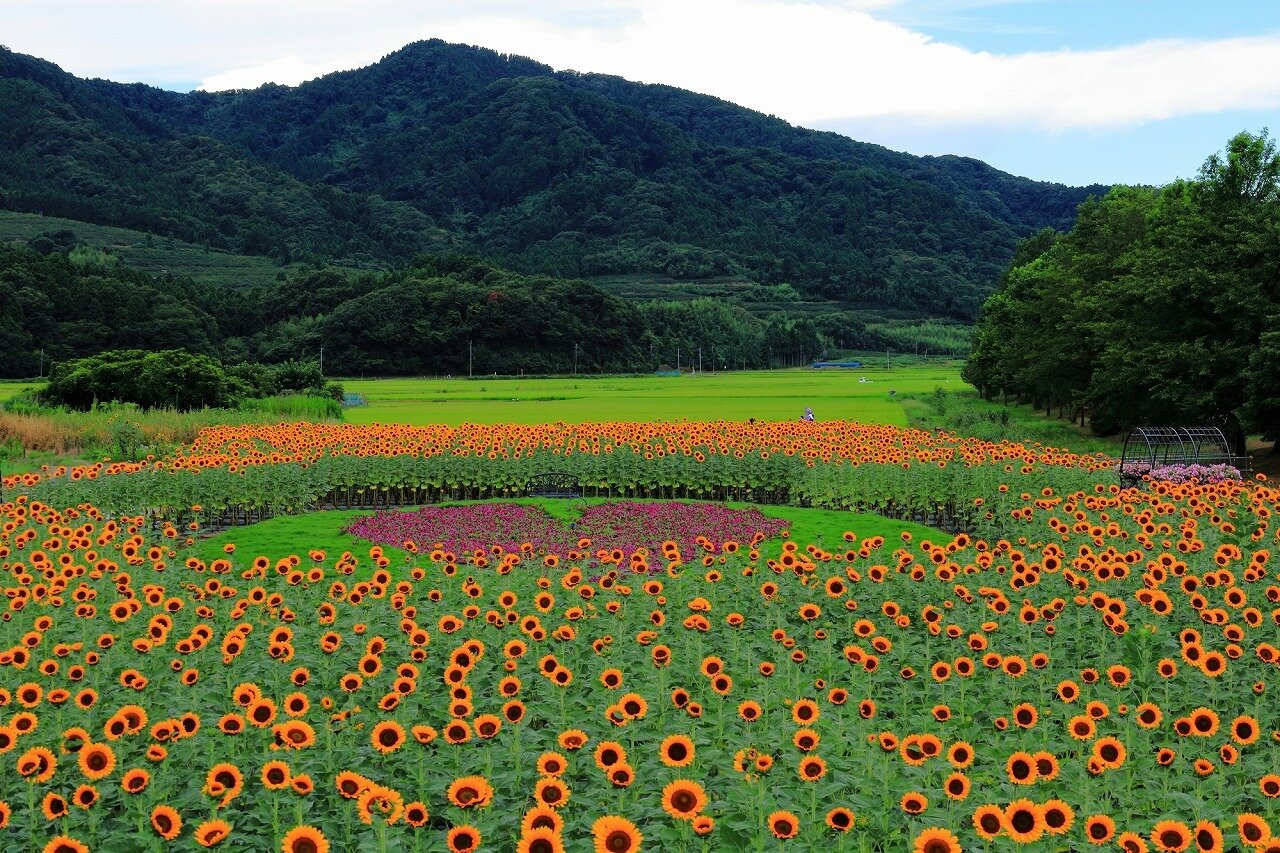 角田山(かくだやま、標高481m)を背景に、四季折々の花が咲きます。春は桜と菜の花が広がり、夏にはかわいい向日葵畑が楽しめます。
