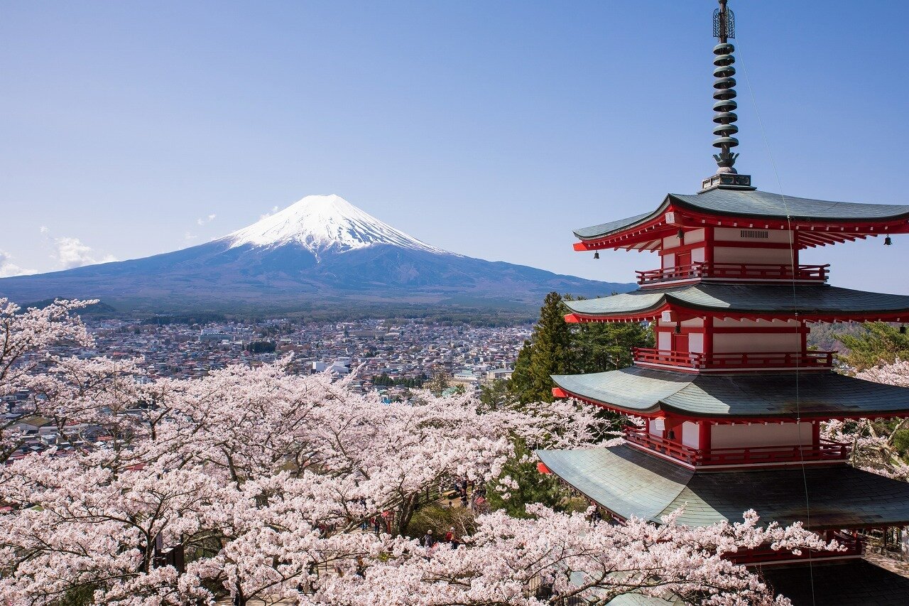 富士吉田市にある五重塔がシンボルの神社です。300本の桜が咲きます。展望デッキかあり、富士山と五重塔と桜が展望できます。