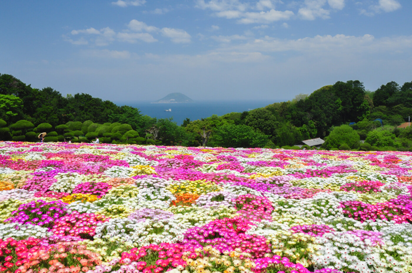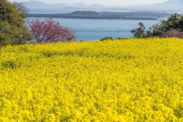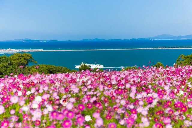 福岡市内からフェリーで約10分で行ける能古島は、まさに花の島。海に囲まれた絶景のロケーションで季節ごとに様々なお花を楽しめます。