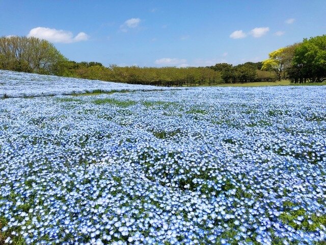 季節を通して様々な花が楽しめる、福岡の人気スポット。スイセンやネモフィラやコキア、コスモスなど一面に広がる花風景に出合えます。見頃の時期が合う年には、桜のピンクとネモフィラブルーの爽やかな共演を見ることができます。