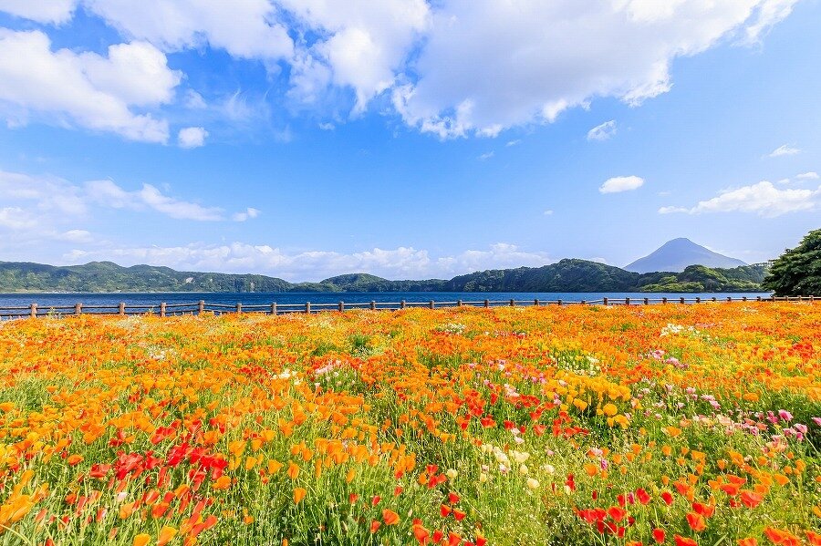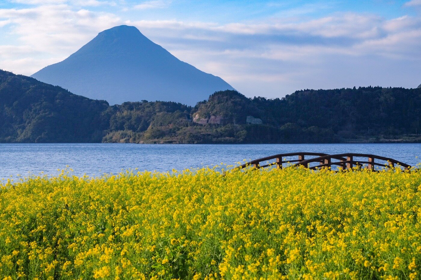 池田湖は火山活動によって作られた周囲15kmの九州最大のカルデラ湖で、水深は233cmです。体長約2m・胸回り60cmの大うなぎが多く生息しており、指宿市の天然記念物にも指定されています。謎の生物(UMA)「イッシー」が棲むといわれれていることでも有名です。薩摩富士とも称される日本百名山の開聞岳を、湖畔に咲く花々越しに望めることができる、鹿児島の絶景お花スポットです。四季折々に花が咲きますが、中でも冬の見ごろに合わせて開催される「菜の花マラソン」は、指宿の恒例行事です。スケジュールに余裕があれば、南九州市にある「知覧特攻平和会館」に立ち寄って欲しい。そこを訪れた後に開聞岳を眺めると、これまでとは違う価値観で風景を愛でることができるはず。