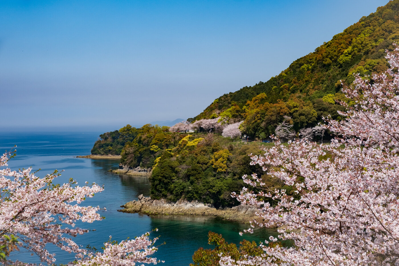 熊本県水俣市の湯の児チェリーラインは、不知火海沿いに約5kmほど桜並木が続くドライブロードで「日本さくら名所100選」に選定されています。3月下旬から4月上旬には約500本の桜が訪れた人を楽しませています。