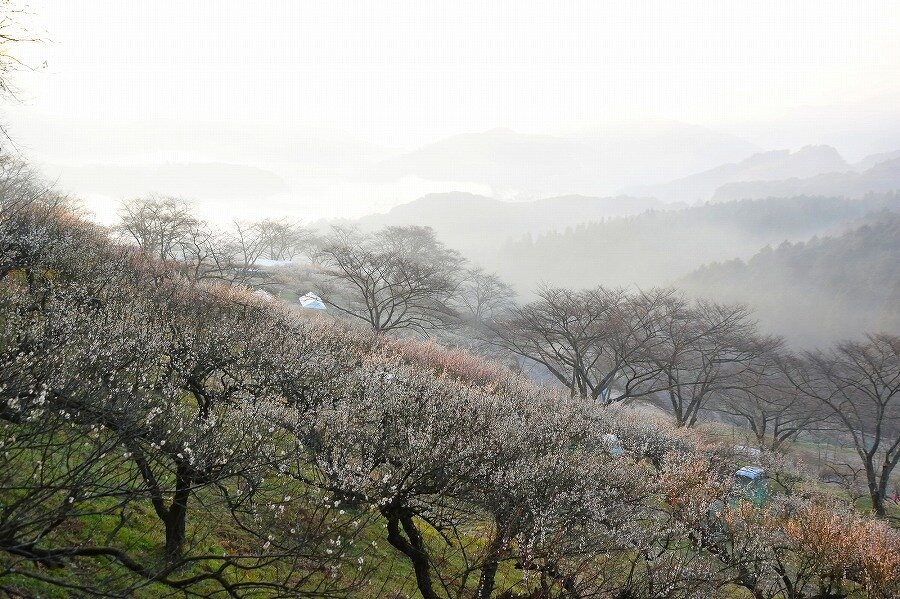 約8haの丘陵地の斜面に4600本の梅が植えられた見晴らしの良い梅林です。日本で唯一、ループ線とスイッチバックを併せ持つ秘境駅といわれる大畑駅から徒歩10分足らずでアクセスできるのも嬉しいところ。