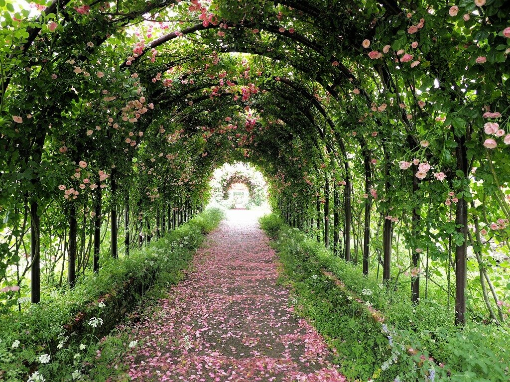 西日本最大級の1,320平方メートルのバラドーム温室。屋外の庭園と合わせて750種、4,500株のバラが植えられています。
