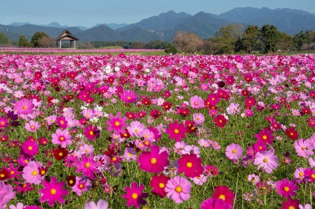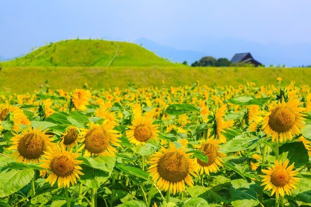 古墳時代から続く歴史に思いを馳せながら一面の花風景に浸れます。春は2,000本の桜と30万本の菜の花、夏には100万本のひまわり、秋には300万本のコスモスが楽しめます。