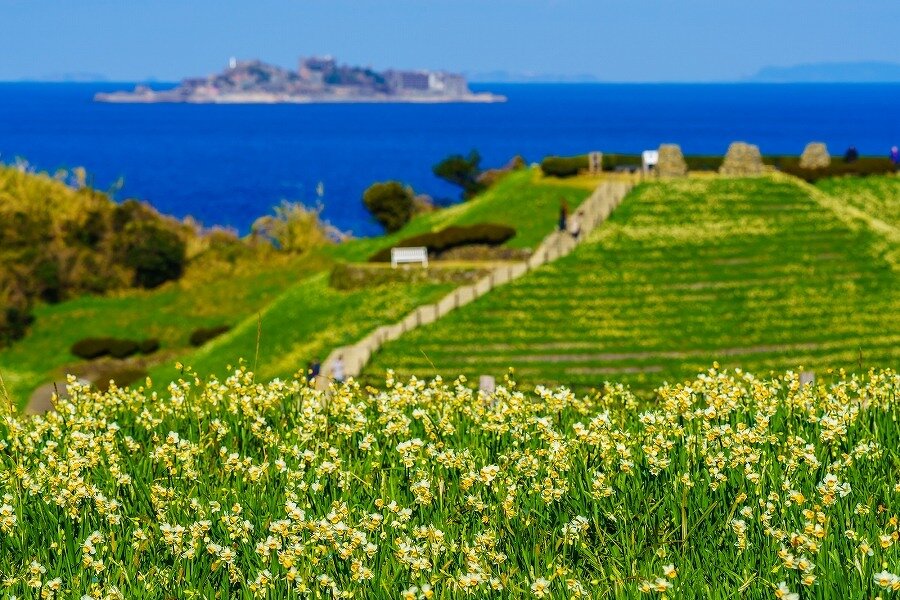 対馬海流に面し比較的温暖な気候であったためか、ここ野母崎地区には日本水仙が自生していて、戦前から水仙が栽培されていました。水仙の生産量は全国3位、「長崎水仙」として出荷されています。約1,000万本もの水仙が咲き誇り、辺り一面に水仙の香りが漂うこの公園は長崎県で唯一、環境省の「かおり風景100選」に選ばれています。小高く広い公園で水仙の花と香りを楽しみながら、海の向こうに世界遺産の軍艦島を眺めることができる贅沢な風景です。