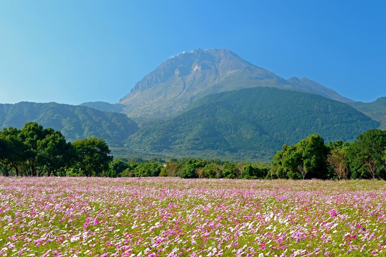 長崎県島原半島、雲仙普賢岳山麓の公園です。「火張山」の名前の由来は、ここに噴火災害時に火を見張っていた人がいたからです。普賢岳をバックに、春は桜、菜の花、ツツジ、ポピーが順に、秋はコスモスとひまわりが咲きます。
