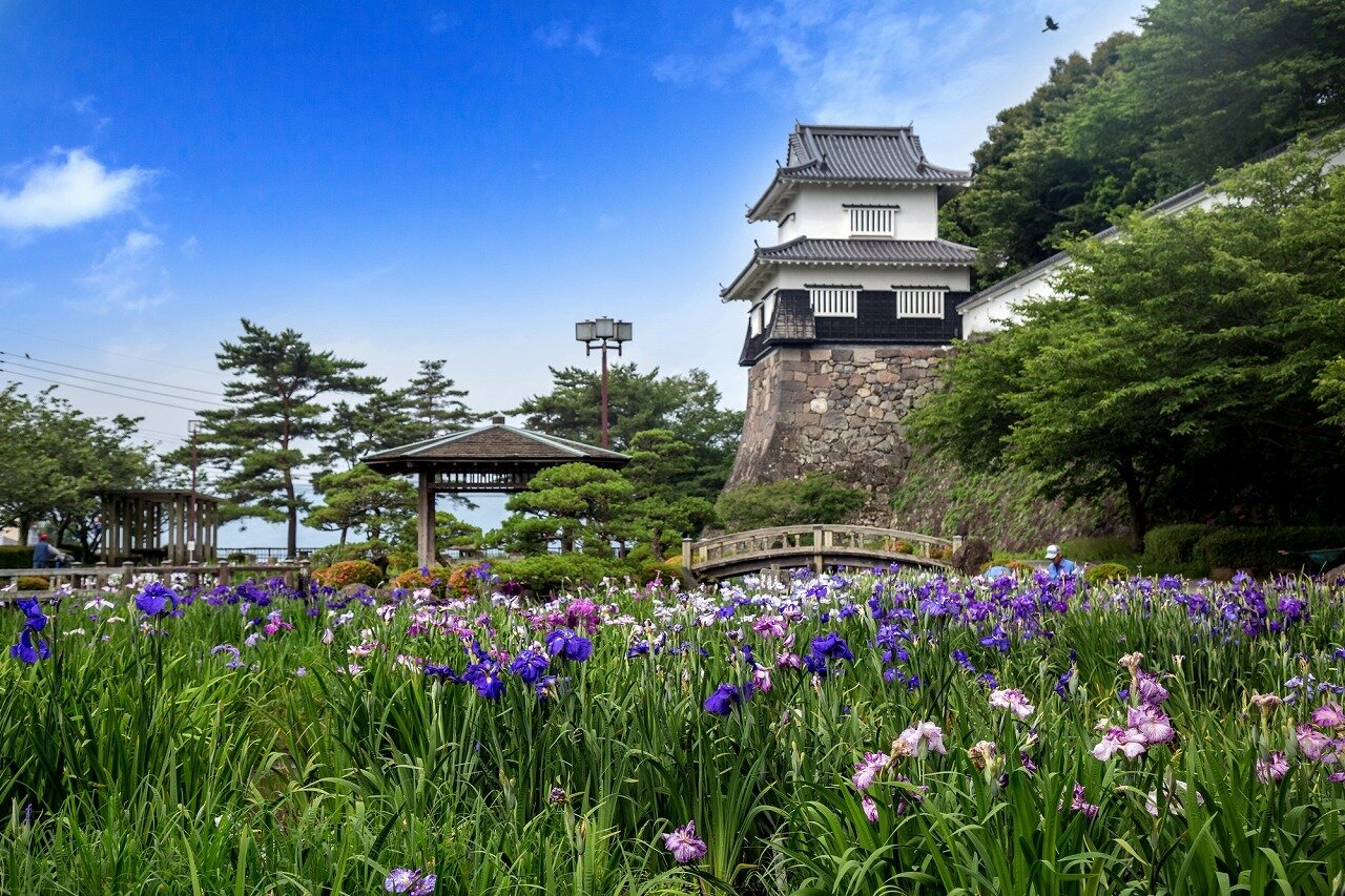 大村湾、玖島崎にある玖島城跡に造られた公園です。桜と花菖蒲の公園で、サクラは、ソメイヨシノ、オオムラザクラなど2,000本が植えられています。ハナショウブは、10万株30万本が5月下旬から咲きます。