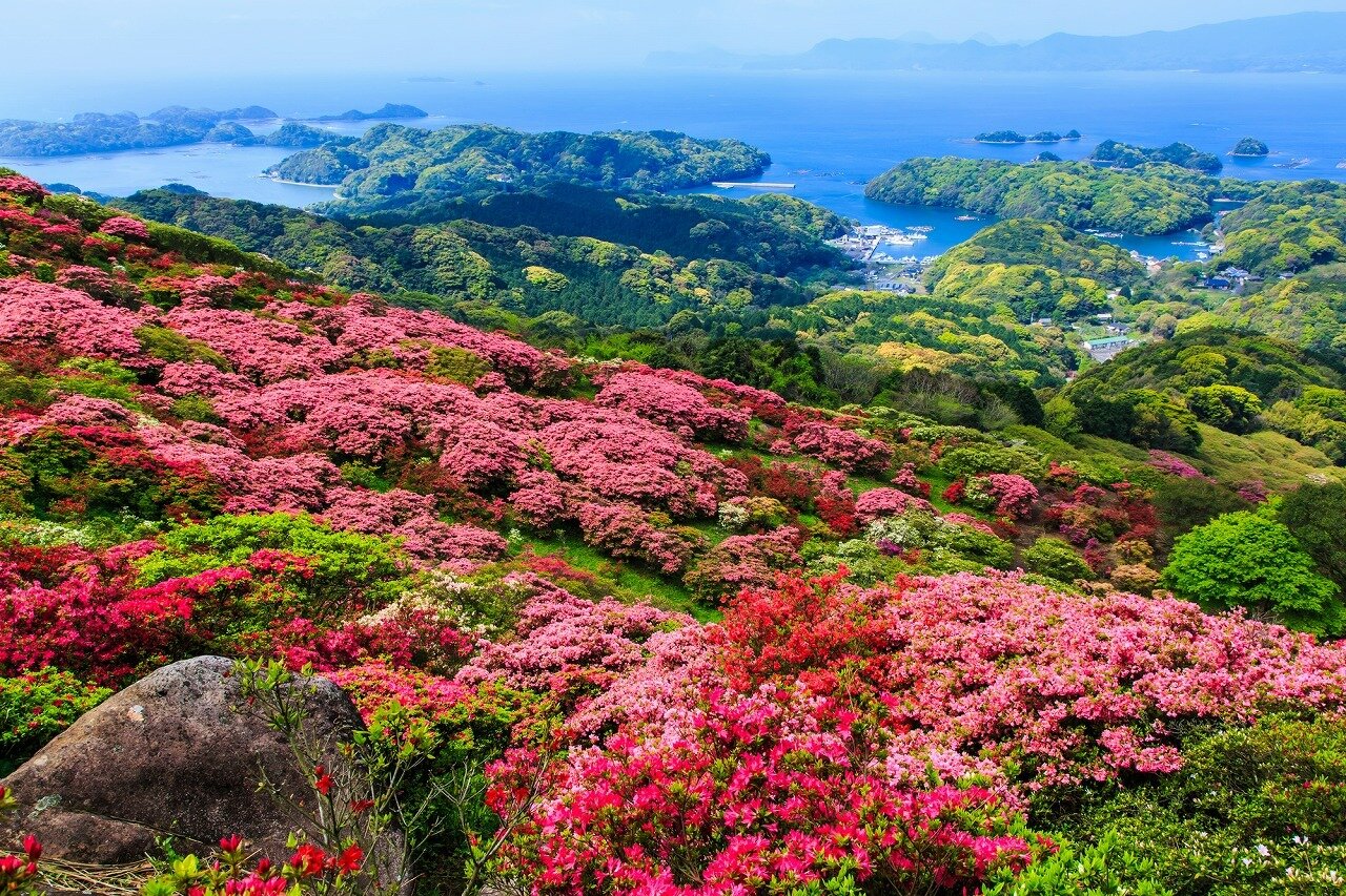 長串山公園 なぐしやまこうえん 長崎県 標高233mの長串山に広がる公園です。平戸島や北九十九島が一望できます。久留米つつじ、平戸つつじなど、10万本のツツジが植えられています。春は、赤、ピンク、白の花が、青い海、青い空、新緑の緑に映え、絶景です。 Webサイト https://www.nagushiyama.jp/ タグ検索 長串山公園 ツツジ 長崎県 九州・沖縄 春 海 月 4月 都道府県 長崎県