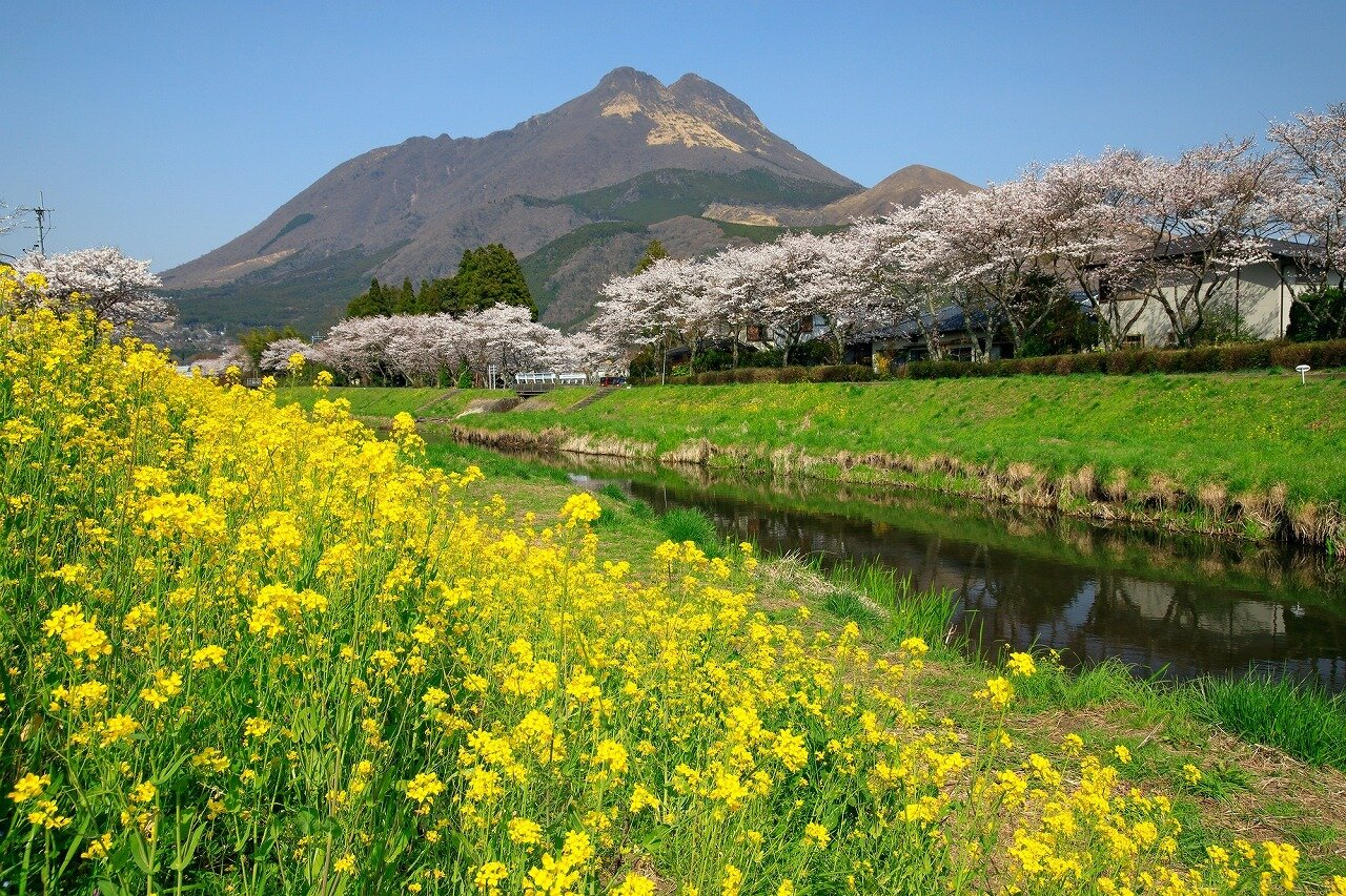 由布市を流れる大分川沿いに、桜並木があります。春は、由布岳を背景に、桜と菜の花が川沿い一面に咲きます。