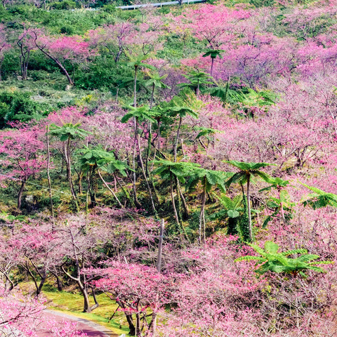 沖縄の中でも一番に咲くと言われる桜の名所です。例年1月下旬から2月上旬頃までが見頃。頂上までの道沿...