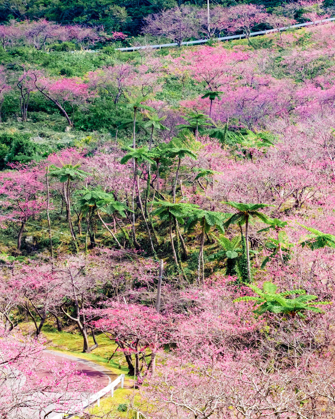 沖縄の中でも一番に咲くと言われる桜の名所です。例年1月下旬から2月上旬頃までが見頃。頂上までの道沿い約4kmにわたり、約7,000本以上の寒緋桜が咲きます。