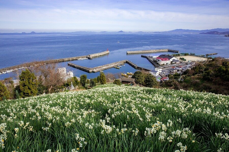 緩やかな斜面いっぱいに真っ白な水仙が咲く中、細い山道を高台まで登ると眼下には水仙越しに漁船が並ぶ港町の風景が広がります。高台から眺める夕日は、「日本の夕陽百選」にも選定されています。水仙畑にある小屋で、水仙の花を購入することもできます。
