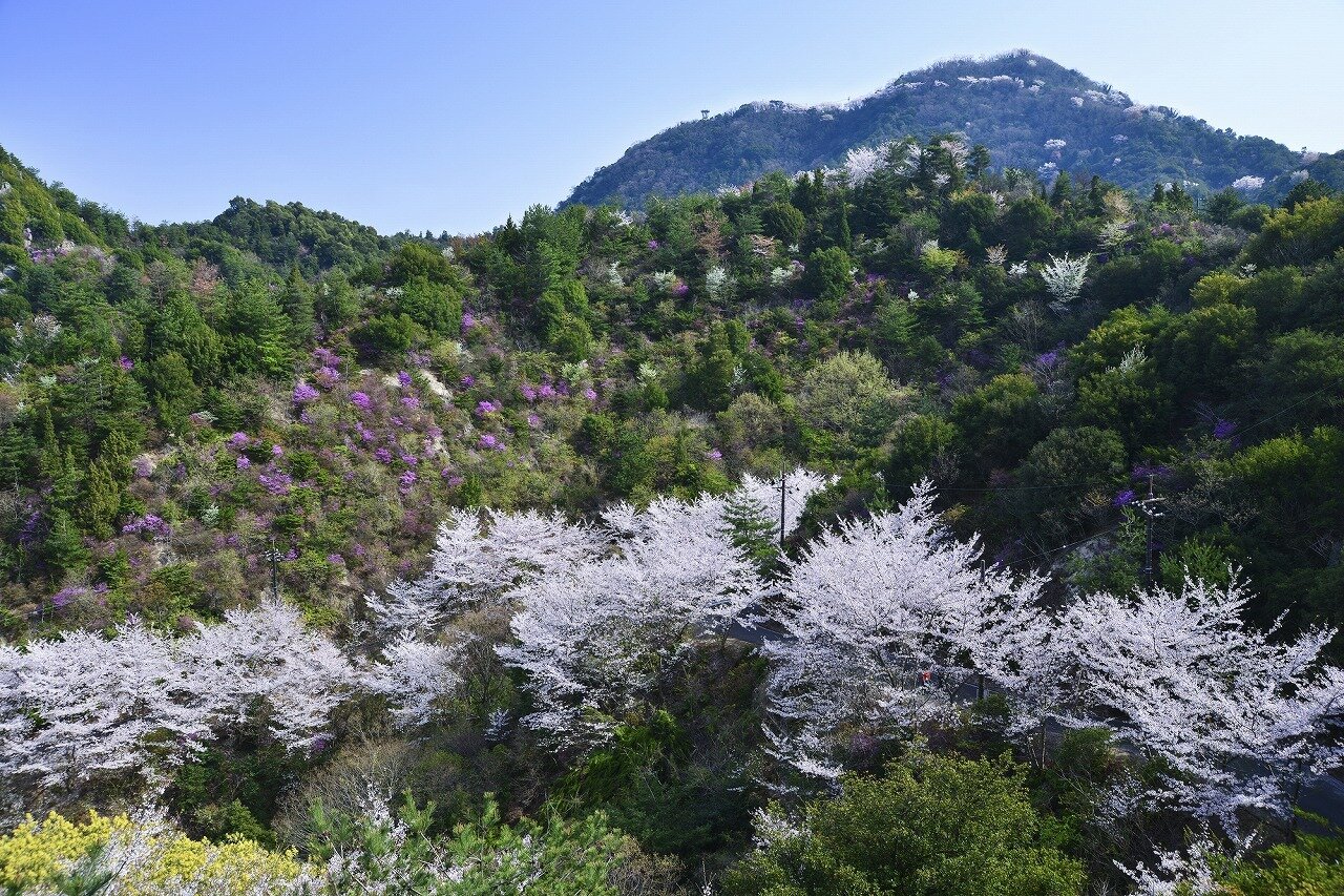 瀬戸内海しまなみ海道近くにある離島、岩城島(いわぎじま)にある標高370mの山です。3,000本の桜が咲きます。山頂には360度見渡せる展望台があります。