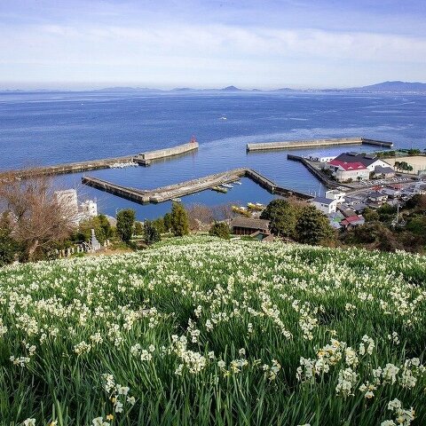 緩やかな斜面いっぱいに真っ白な水仙が咲く中、細い山道を高台まで登ると眼下には水仙越しに漁船が並ぶ...