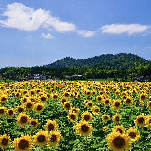 青い空と阿讃の山々を背景に、31万本を超えるひまわり畑を眺めることができます。