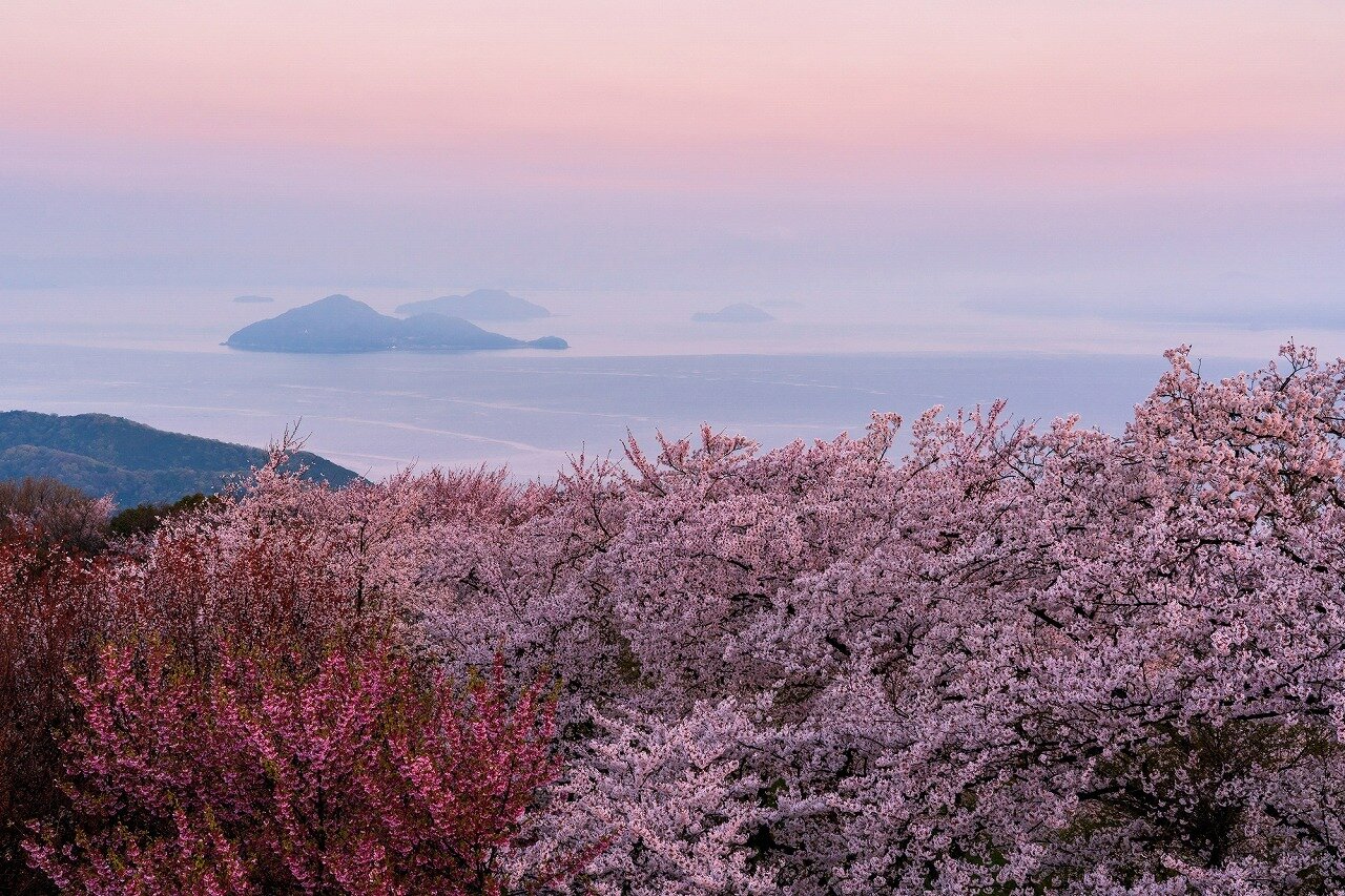瀬戸内海に突き出した荘内半島にある標高352mの山です。1,000本の桜が植えられています。山頂から瀬戸内海に浮かぶ島々と山に咲くの桜の展望が絶景です。三浦島太郎が玉手箱を開けた白煙が紫の雲になったという伝説があります。春は桜と瀬戸内海の絶景が見られ、初夏にはアジサイも楽しめます。