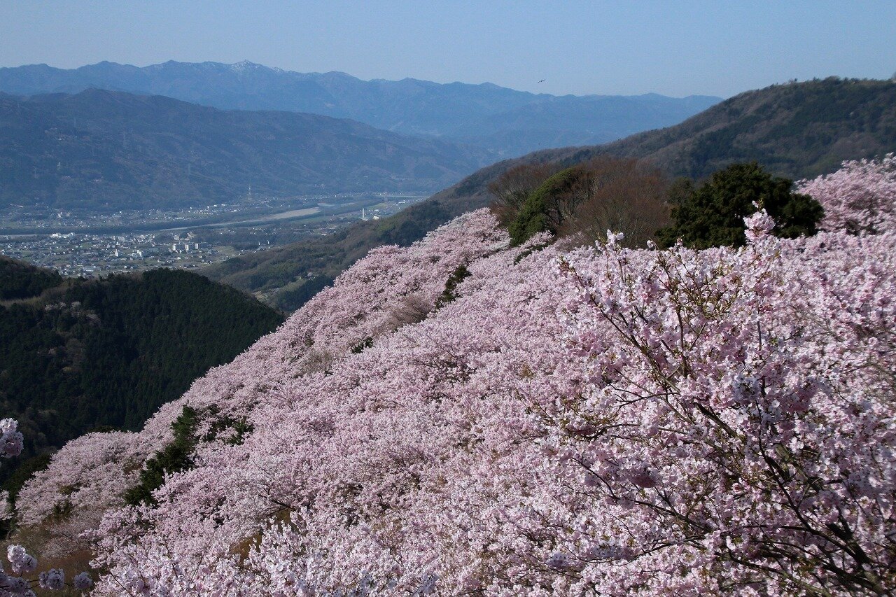 標高400mの八百萬神之御殿境内の山斜面に、8,000本のソメイヨシノなどの桜が咲き誇ります。