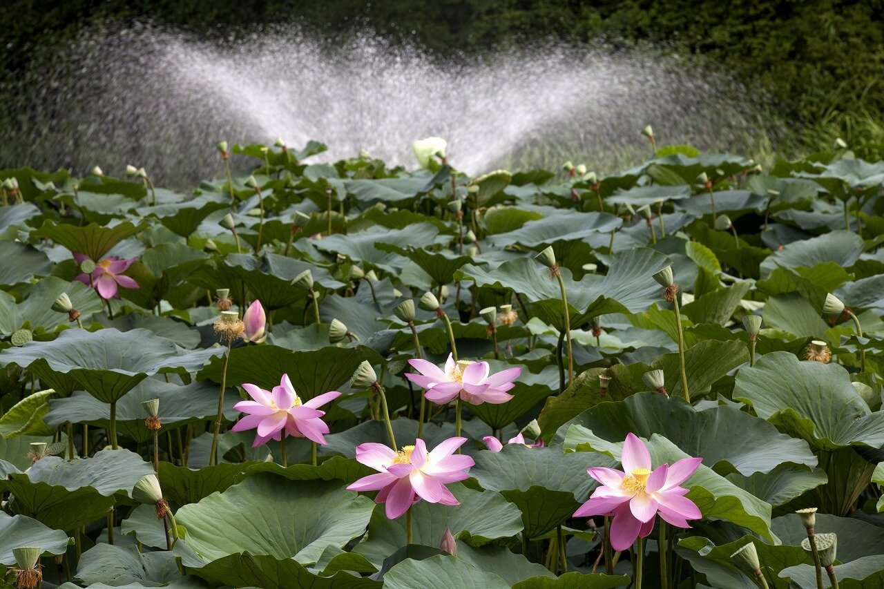 久保田城跡に造られた都市公園です。桜は園内に650本植えられ、「日本さくらの名所100選」に選出。大手門のお堀にハスの花がたくさん咲きます。7月はライトアップされます。蓮は大賀蓮とされてきましたが、交雑したらしく現在は漁山紅蓮と類推されています。大賀蓮は純粋栽培するため鉢植えで栽培中とのこと。