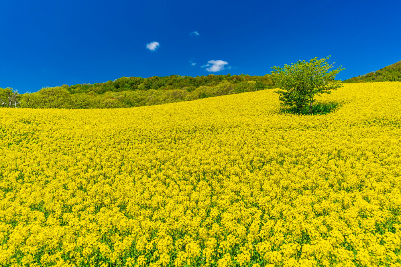 三ノ倉高原のスキーゲレンデを利用した花畑。春には菜の花(350万本)、夏にはひまわり(250万本)、秋にはコスモス(100万本)畑となります。