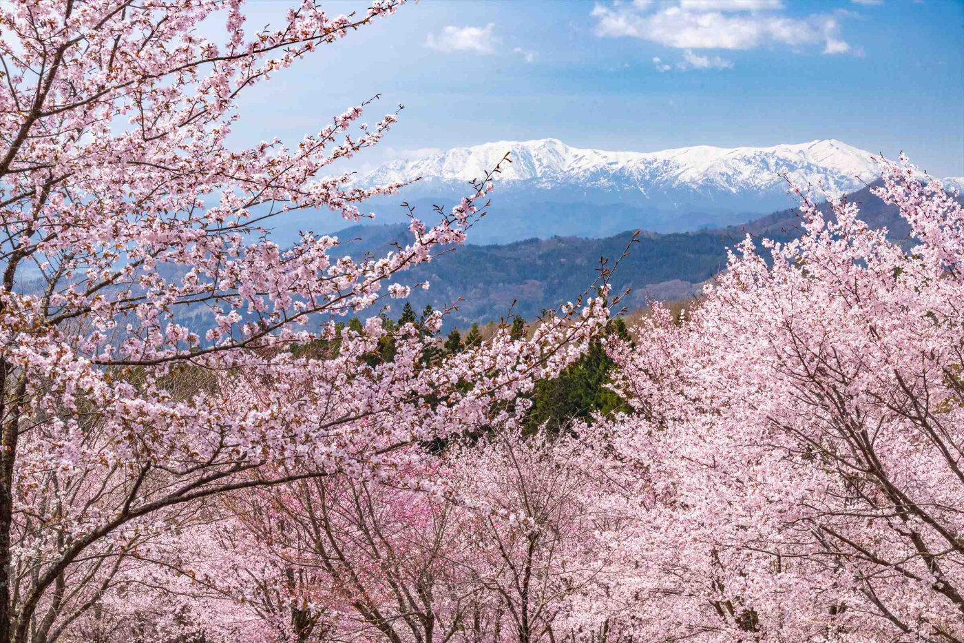 2001年の敬宮愛子内親王(としのみやあいこないしんのう)御誕生を記念して、2,001本のオオヤマザクラが植樹されました。現在、3,000本になりました。濃いピンクの花が一面に咲きます。残雪の飯豊(いいで)連峰と桜のコラボも美しい名所です。