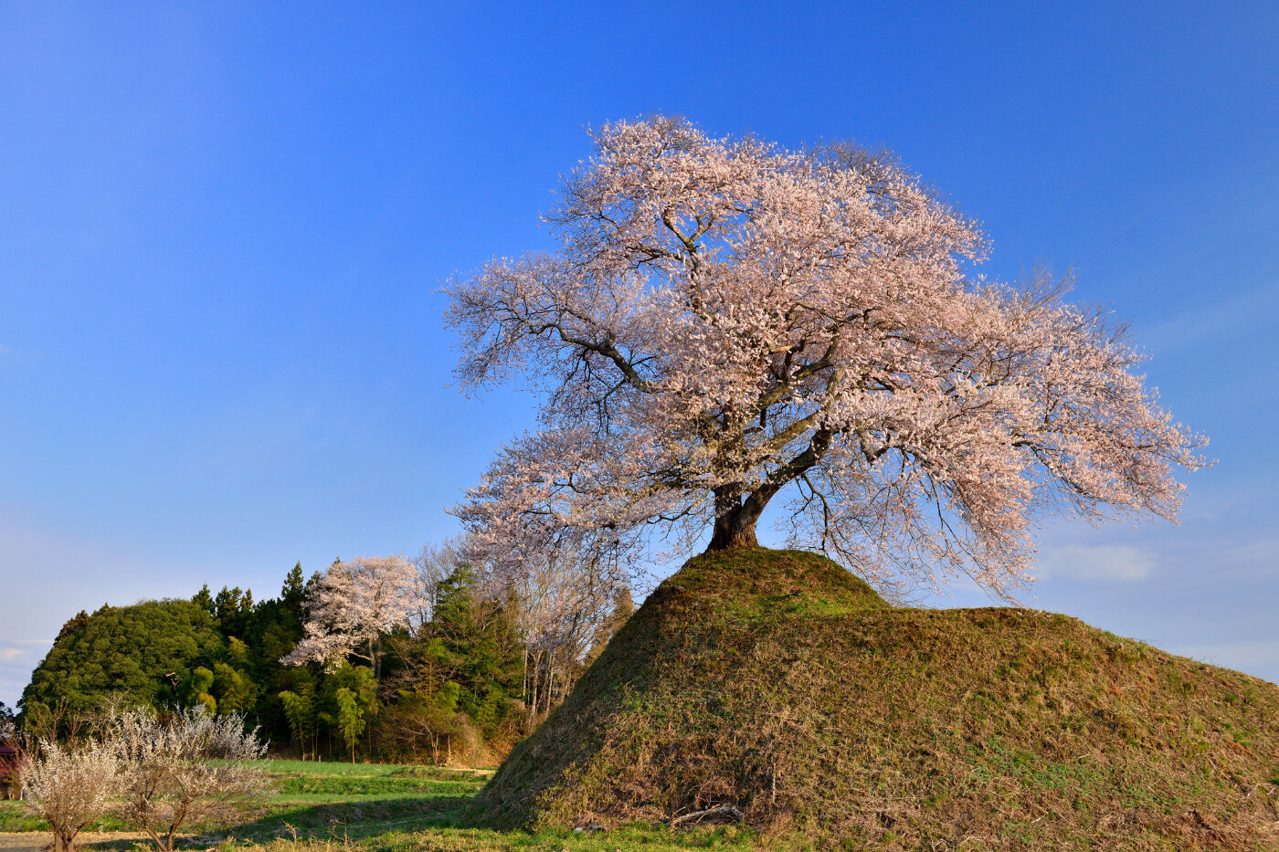 田畑の中の小高い丘の上に咲く一本桜。樹齢150年とも200年ともいわれていますが、不詳。