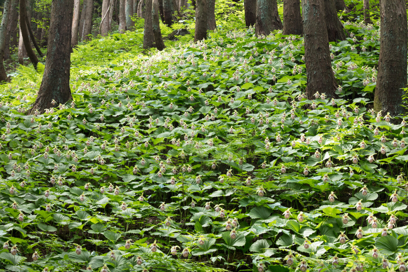 約37,000株のクマガイソウが群生し、約11,000個の花が咲きます。開花期のクマガイソウ祭り期間のみ一般公開される群生地。クマガイソウの他にもヤマブキソウ、ニリンソウ、ホウチャクソウなど多くの山野草を見ることができます。