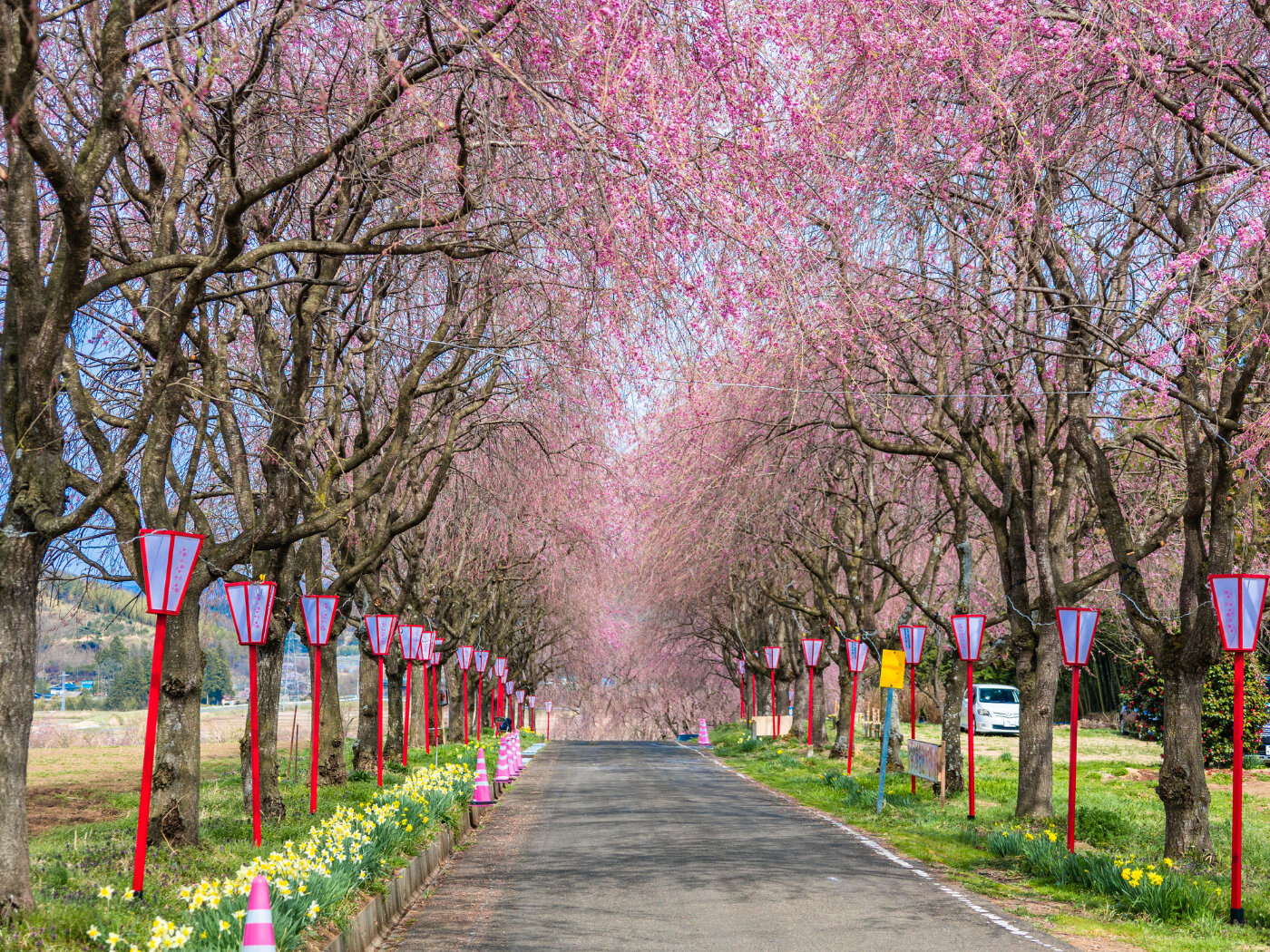 道路沿いに560mほど続くしだれ桜並木