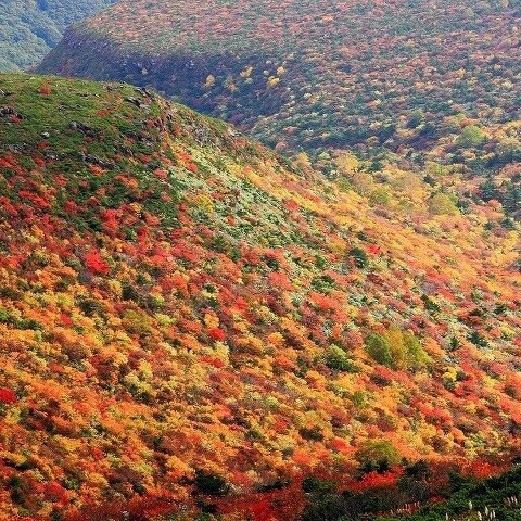 山腹全体が赤や黄色に染まる絶景。ロープウェイに乗って気軽に空中散歩を楽しめます。