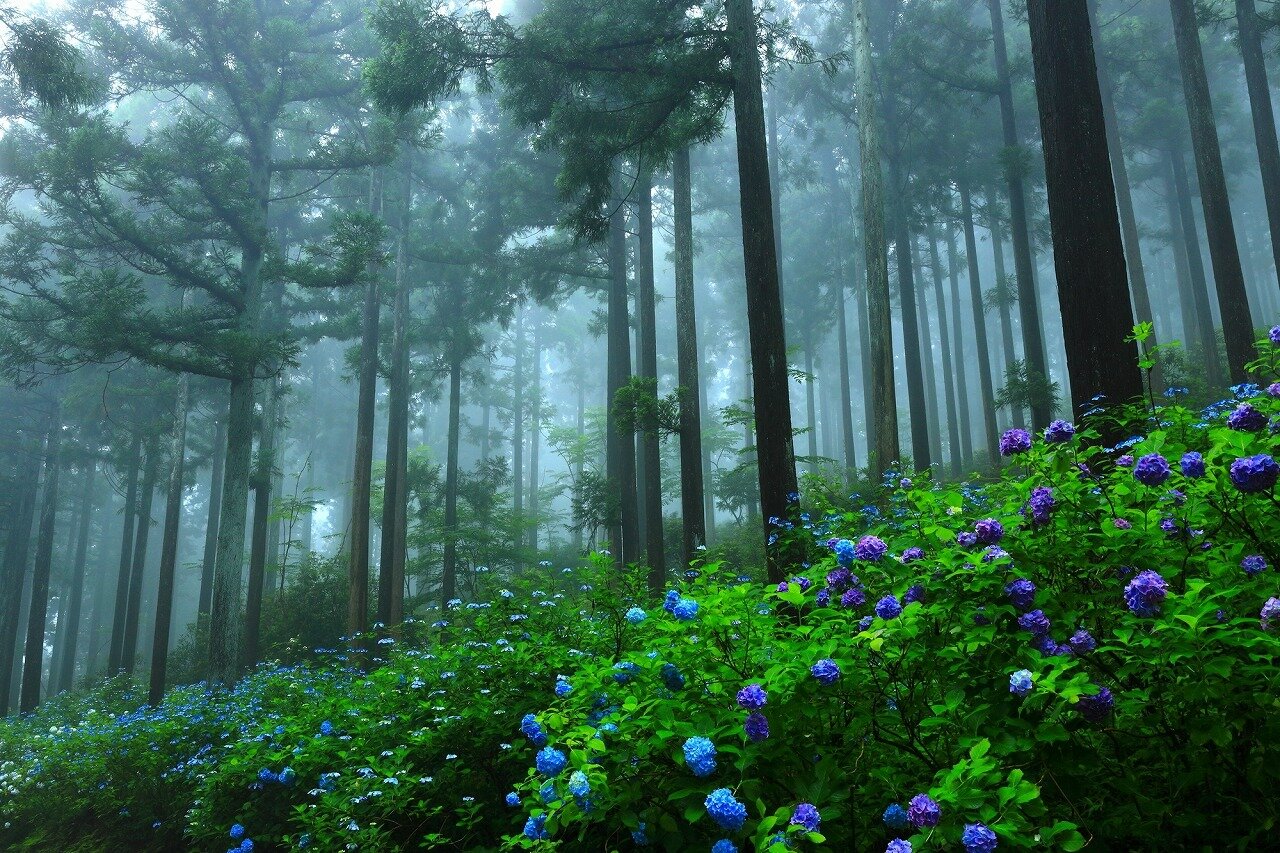 15,000 m2の広大な杉林の中にあるみちのくあじさい園。早咲きから遅咲きまで 400種、4 万株のあじさいが次々と色や形を変えて広がります。杉林以外にも一面にあじさい畑が広がるスポットや色鮮やかなあじさいが池の表面を埋め尽くす「あじさい池」もあり、あじさいの魅力が伝わります。見頃は 6 月下旬から 7 月下旬まで。未来に残したい日本の花風景「池坊 花逍遥 100 選」認定されています。