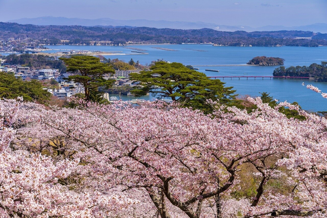 諸国行脚の西行法師が、出会った子供と禅問答をして、負けてしまい、松島に行くことを諦めたと伝えられる場所です。ソメイヨシノとオオヤマザクラが植えられています。小高い場所にあり、白衣展望台からは、桜とともに松島湾が展望できます。