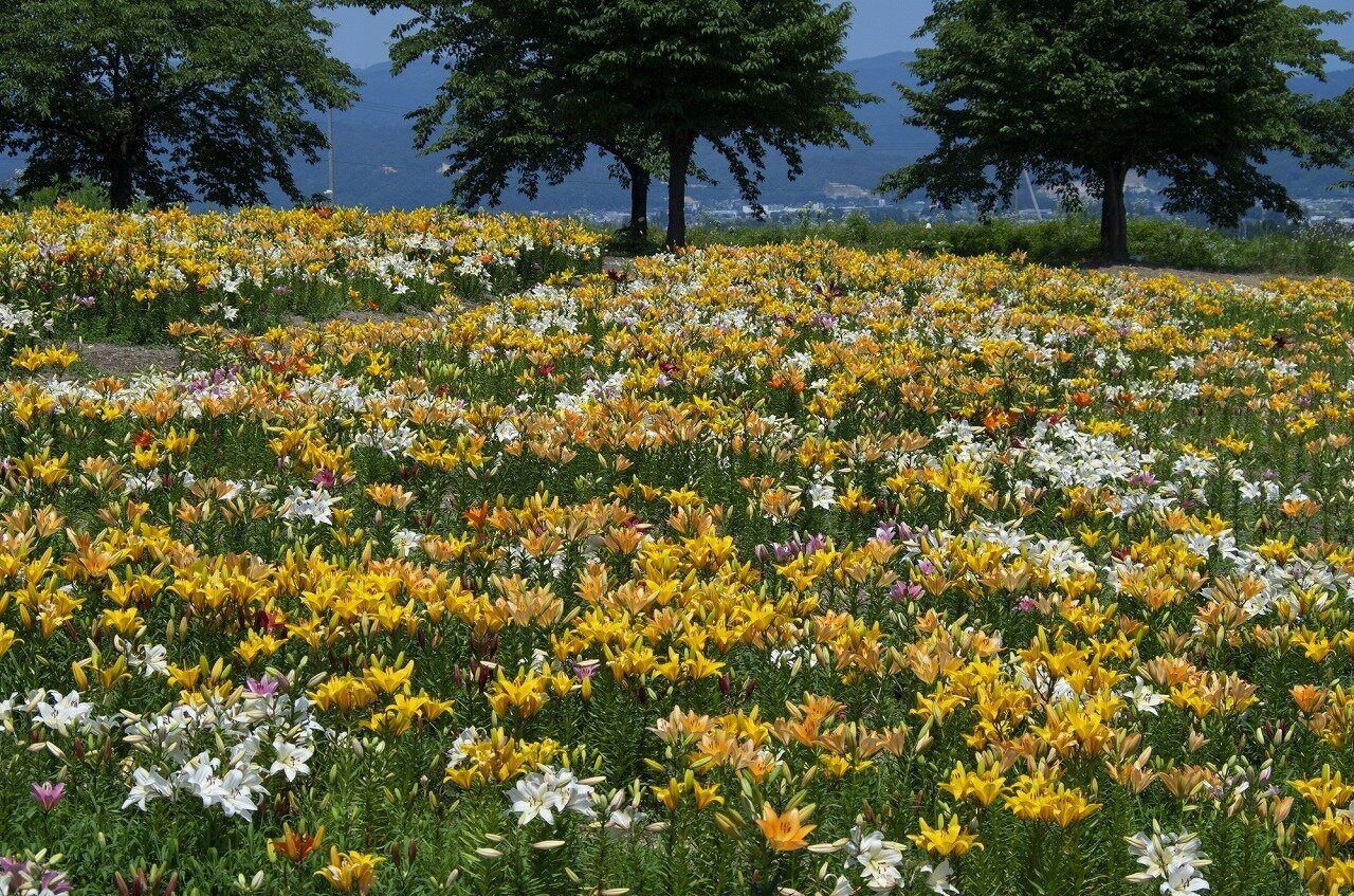 山形県飯田町(いいでちょう)のゆり園です。7ha(東京ドーム4個分)に50万株のピンクや白色、黄色、赤色、オレンジ色のユリが咲きます。