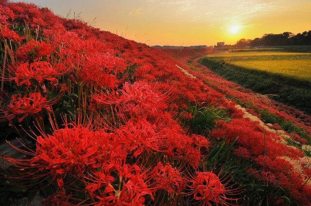 有名な童話「ごんぎつね」の舞台となった矢勝川の南側提を約 1.5km にわたり、300 万本の彼岸花が、まるで絨毯を敷いたように真っ赤に広がります。「ごんぎつね」の作者、新見南吉と遊んだことがある小栗大造さんが、約 30 年前に地域住民と植栽したのがはじまりです。9 月中旬から 10 月初旬には「ごんの秋祭り」が開催され、結婚式や花嫁行列、ライトアップ、紙芝居などのイベントがあります。付近には、新見南吉の生家や記念館も見学できます。