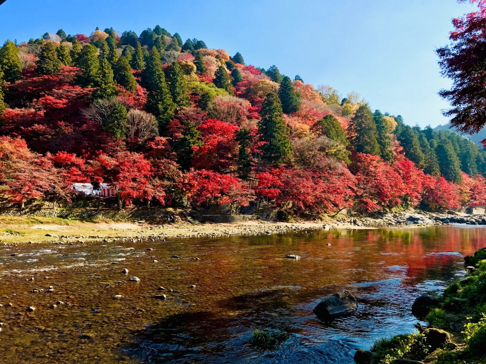 愛知県屈指の紅葉の名所。香嵐渓にある香積寺の和尚が、寛永11年(1634年)に参道から香積寺まで楓や杉などを、植えたのが始まりといわれています。香積寺から約20分程で登れる裏山の飯盛山の山頂付近の紅葉も見事。また、早春の飯盛山ではカタクリやニリンソウ、シャガなどが咲き、春の訪れを知らせてくれます。