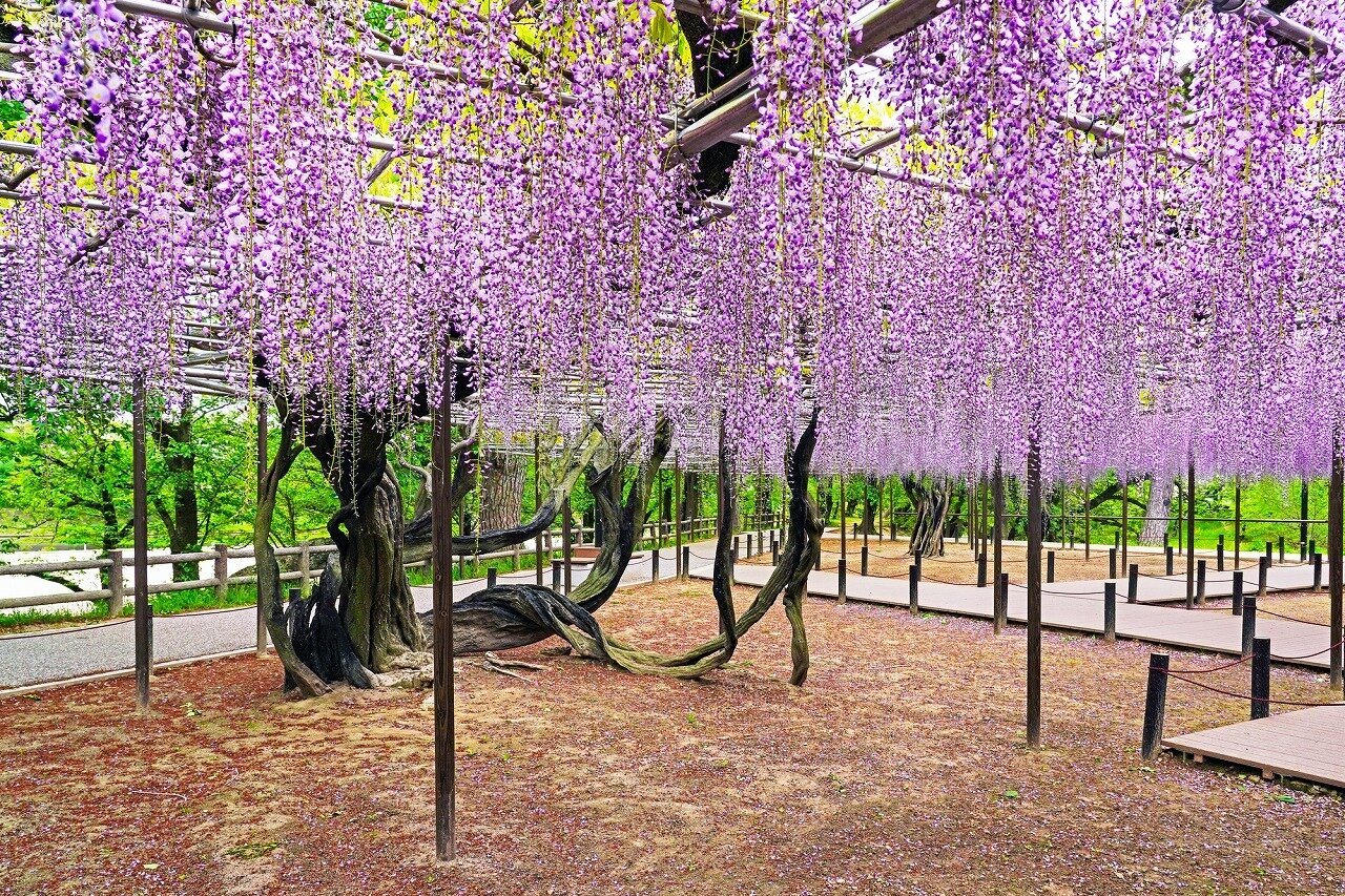 園内及び乙川、伊賀川沿いに合わせて800本の桜がある、さくら名所100選に選ばれた公園。1500m2の「五百万石ふじ」と呼ばれる藤棚も有名。