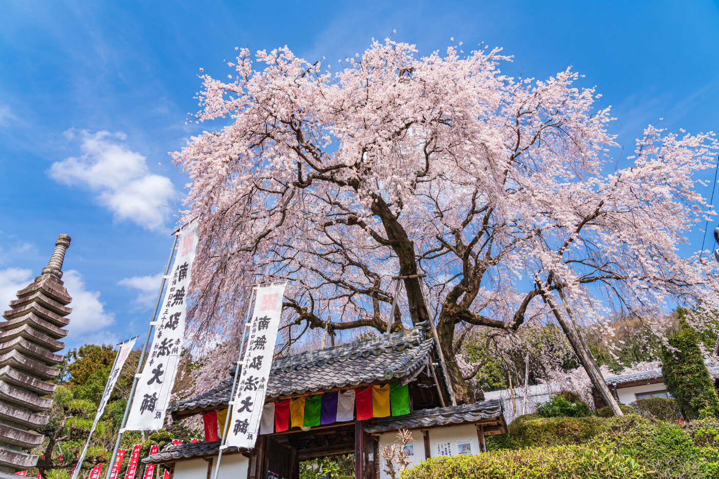 曹洞宗の寺院である林陽寺は、岐阜市内を流れる長良川の畔にあります。境内の樹齢200年になるしだれ桜は3月下旬に満開を迎え、見頃の時期には多く参拝者の目を楽しませています。また夜にはライトアップも行われ幻想的な風景が広がります。