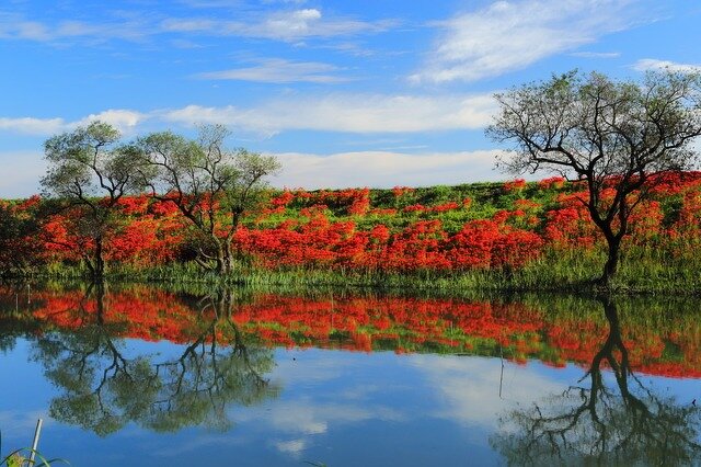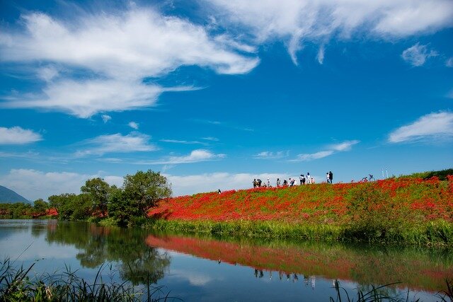 津屋川堤防沿い 3km にわたり、約 10 万本の彼岸花が連なります。堤防の斜面を真っ赤に染める彼岸花や養老山麓、田園の景色と川面に映る景色と二重に楽しめ、撮影スポットとしても人気です。堤防の上は遊歩道になっており、彼岸花を眺めながら散策もできます。9 月中旬から 10 月初旬が見頃です。9 月下旬に開催される津屋川ひがん花まつりでは、俳句コンテストや朝市、網打ちの実演などが行われます。
