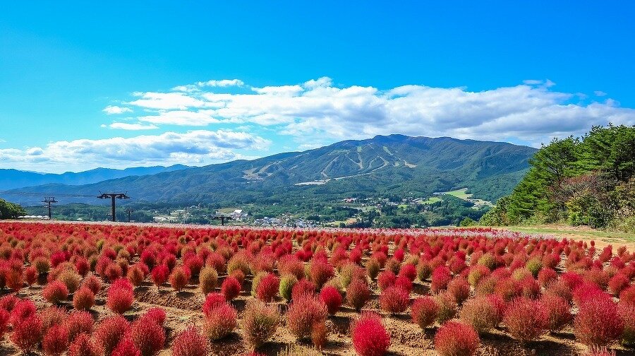 大日ヶ岳を望む見晴らしの良い場所です。真夏のペチュニアから秋のコキアまで楽しめます。