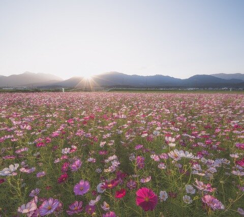 コスモス畑の向こうには、鈴鹿山脈を望むことができます。そこに沈む夕日とコスモス畑のコラボが美しい。