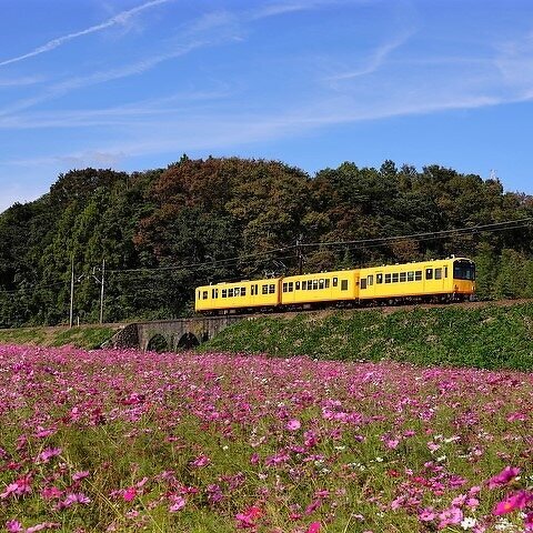 三岐鉄道の黄色の車体とのコントラストが可愛いコスモス畑です。花畑の位置は年によって変わります。