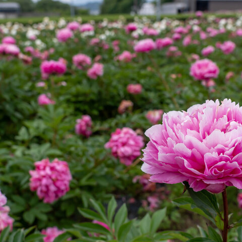 シャクヤクは5万株(約20万本)栽培されており、日本最大級のシャクヤク畑。
