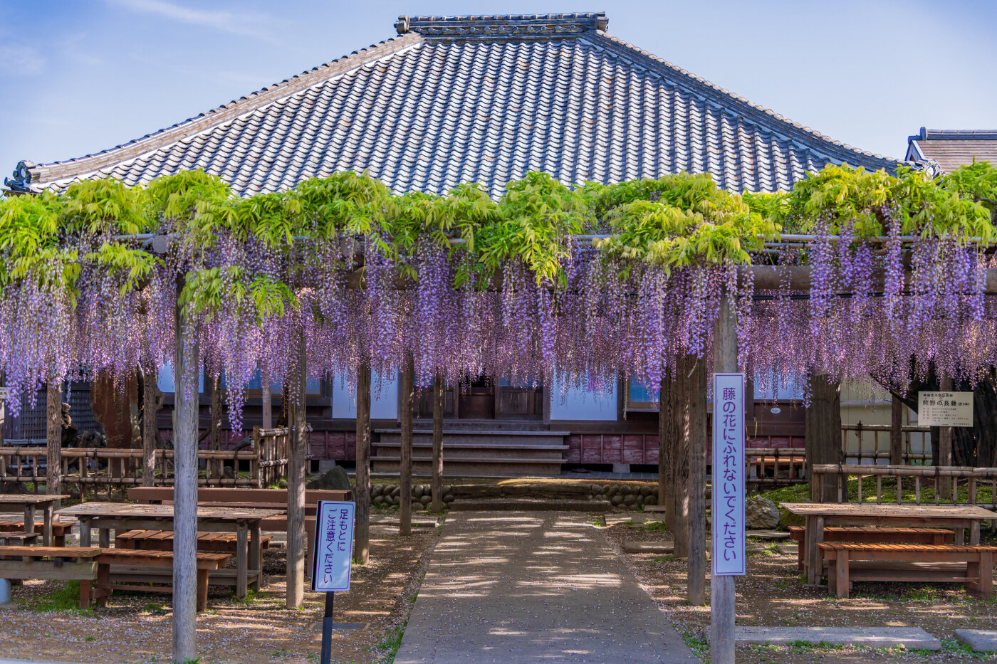 花の房の長さが1m以上にもなる推定樹齢800年の熊野の長藤(国と県の天然記念物)が咲きます。境内にはさらに17本の藤。すぐ裏には、豊田熊野記念公園(西法寺公園)があり、そこにも藤棚があります。