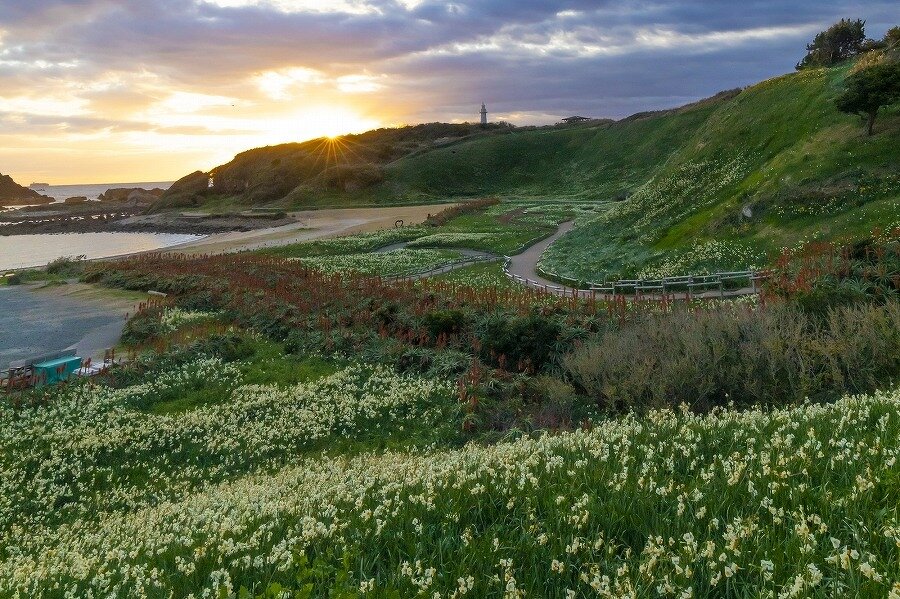 太平洋の青い海をのぞむ丘陵地に野水仙が咲き乱れ、1月の最盛期にはその数約300万本。水仙の甘い香りと冬でも少しあたたかな海風の香りに心が癒される場所。同じ時期に赤いキャンドルのようなキダチアロエの花も咲き、南国の海に来たような景観が広がります。半島の先端に佇む真っ白な爪木崎灯台も見どころ。