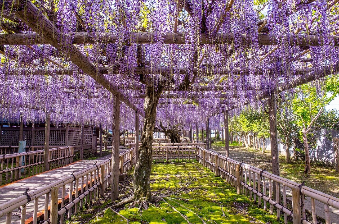 平安時代末期、平宗盛(たいらのむねもり)に仕えて寵愛を受けたと伝えられる熊野御前にゆかりの藤。熊野御前が植えて大切に愛でた藤の木の孫・玄孫であると伝えられています。藤棚が広がる行興寺(ぎょうこうじ)の境内には、熊野御前とその母親のお墓も。1m以上にも垂れる花房により長藤と名付けられました。国指定天然記念物とされているこの長藤の他にも、県指定天然記念物に指定されている藤の老樹が5本あり、それらが藤棚いっぱいに広がって見事な花を咲かせます。