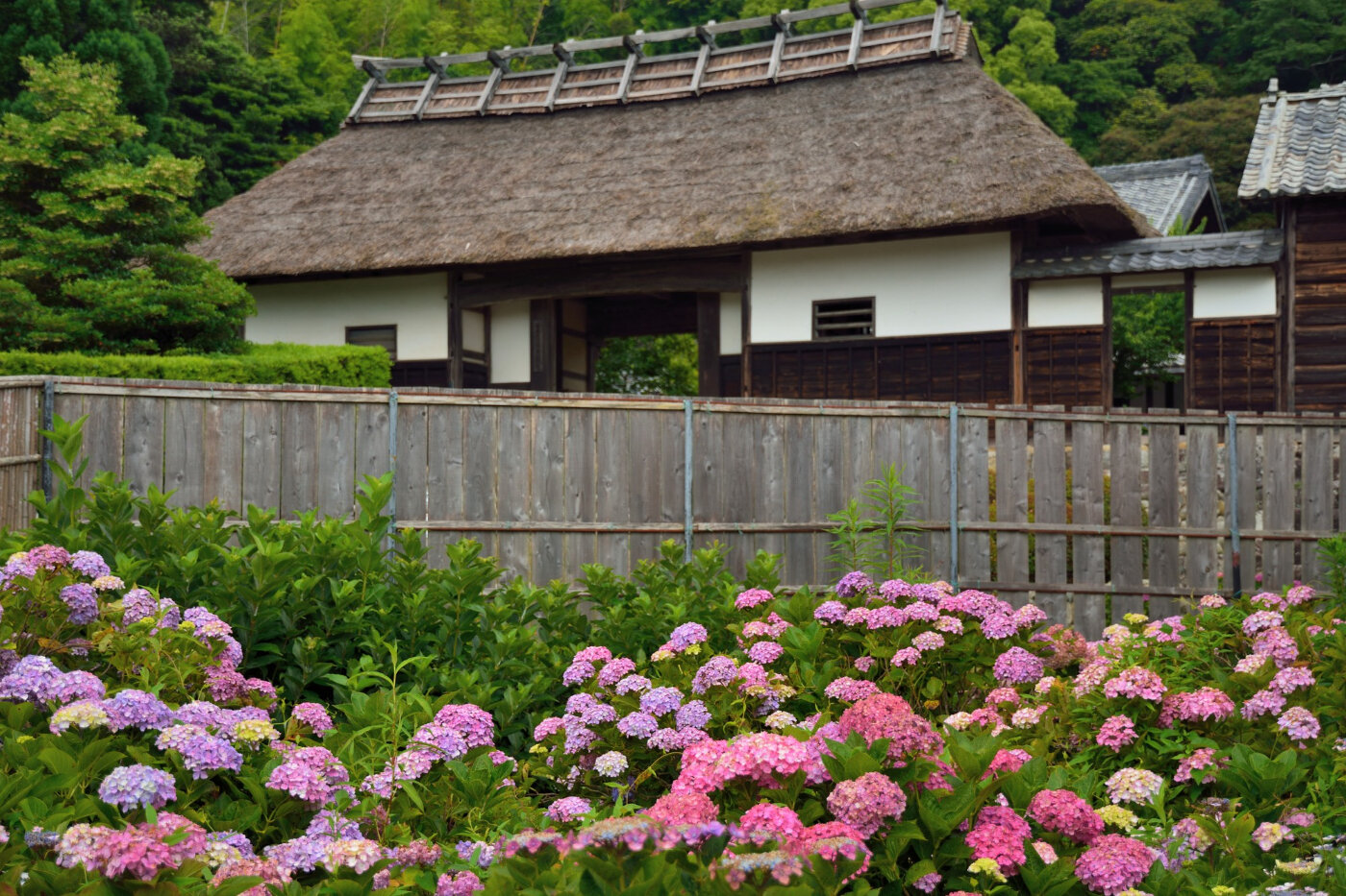 大鐘家は約300年前の建築物で、母屋・長屋門は国の重要文化財」に指定されています。別名「花庄屋」と呼ばれ、約1万坪の庭園には10,000株ほどのあじさいが植栽されています。