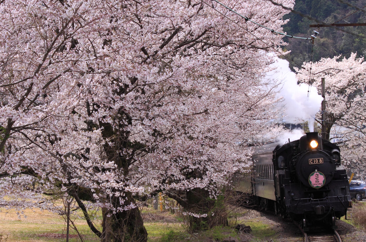 大井川鐵道『大和田駅』と『家山駅』の間あたりにある道路沿いの桜並木。SLと桜のコラボも楽しめます。