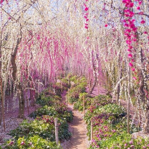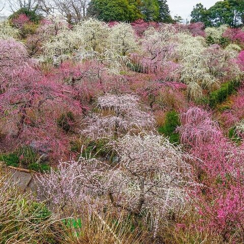 5000?の園内で350本のしだれ梅が楽しめます。独自の「昇竜仕立て」という仕立て方で、竜が雲をつかみ、...